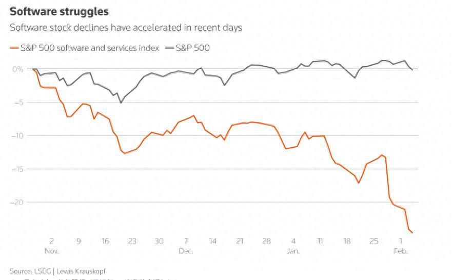 标普500软件与服务指数自10月底的近期高点以来已下跌约25%——同期标普500整体几乎没有变化。一部分交易员甚至对“逢低买入式抄底”这些受重创的软件股兴趣不大,一些期权交易员也选择观望。B Riley Wealth首席市场策略师Art Hogan表示:“这就是‘软件末日’(Software-mageddon)。”